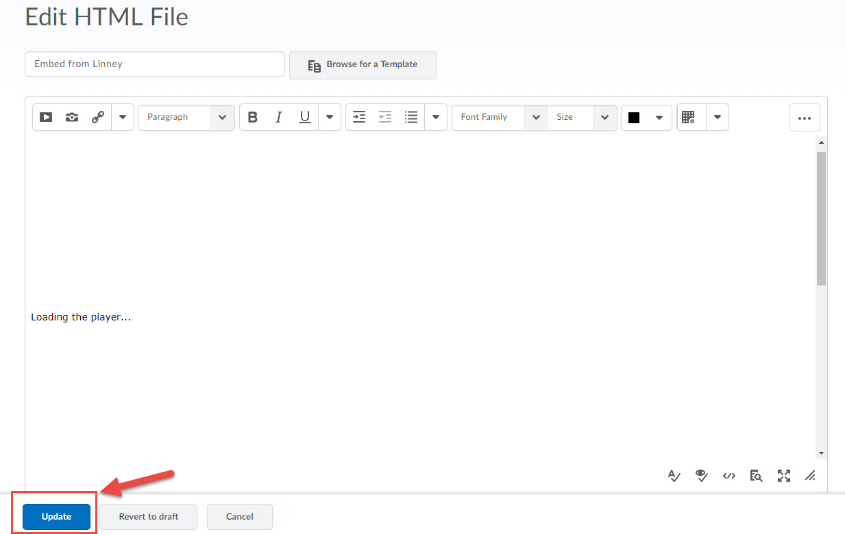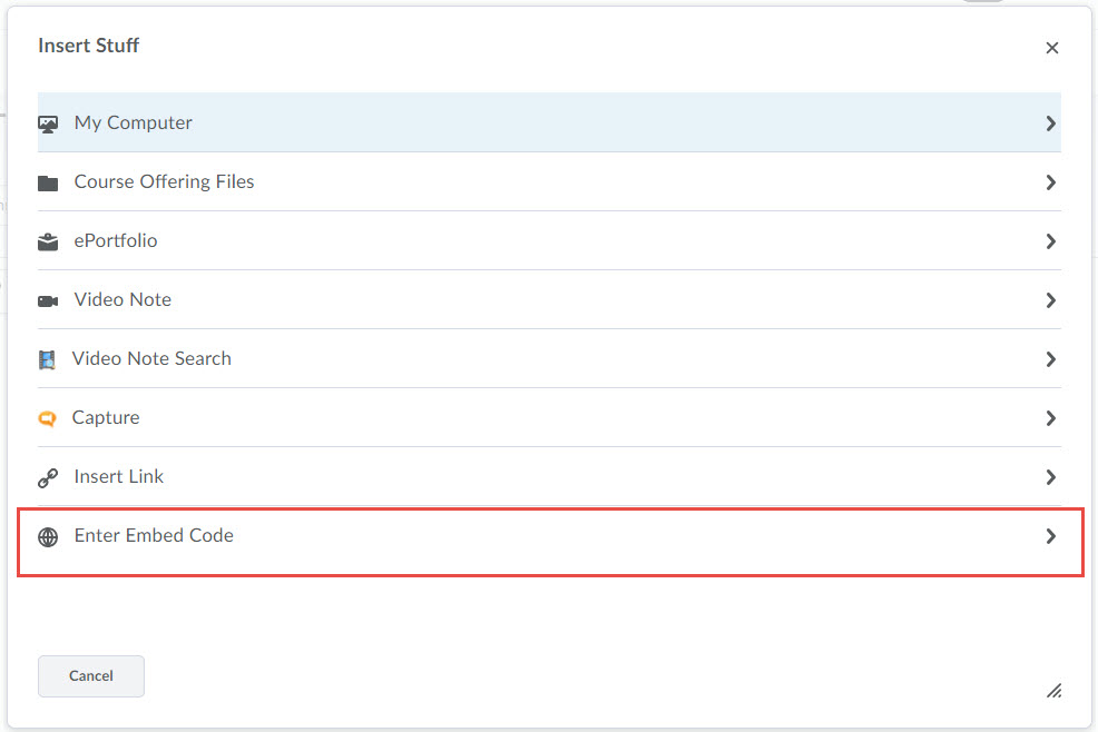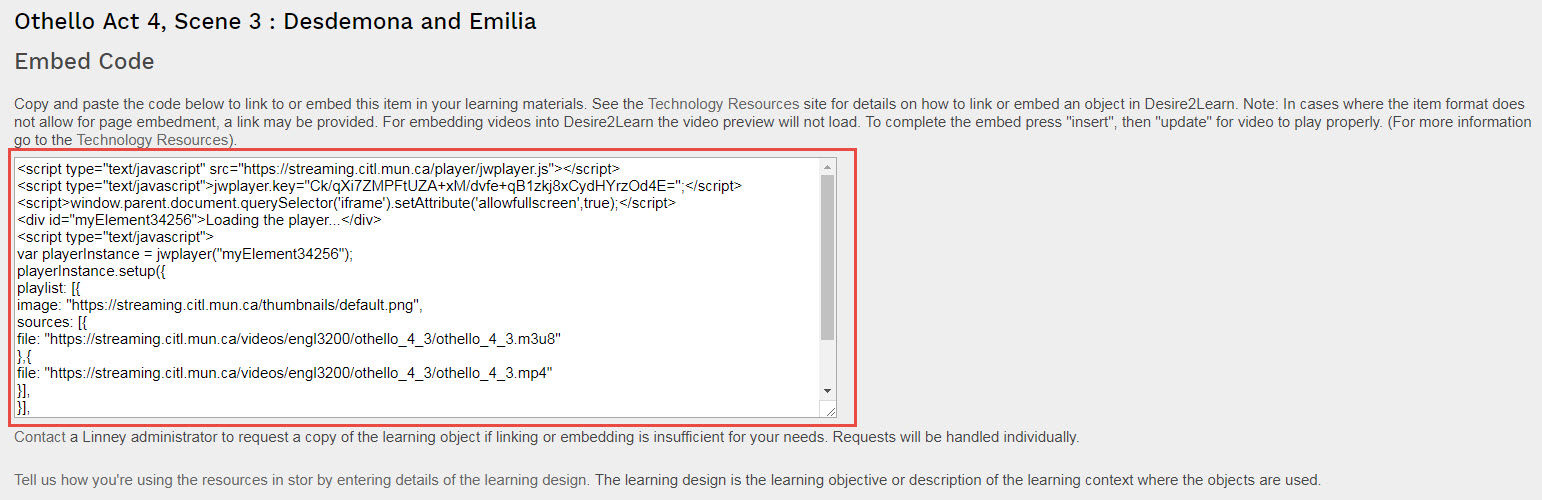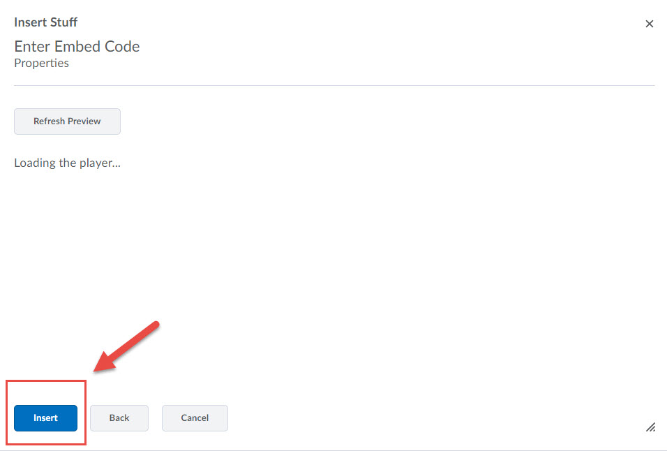 - On the next screen, Brightspace will try to show a preview of your object. Note that videos (mp4s) will not actually preview. The player does not properly load during preview right now, but it will load once you insert the embed code. For all other media (images, audio) a preview will show. Go ahead and insert your object’s embed code. It will load when you update your page.