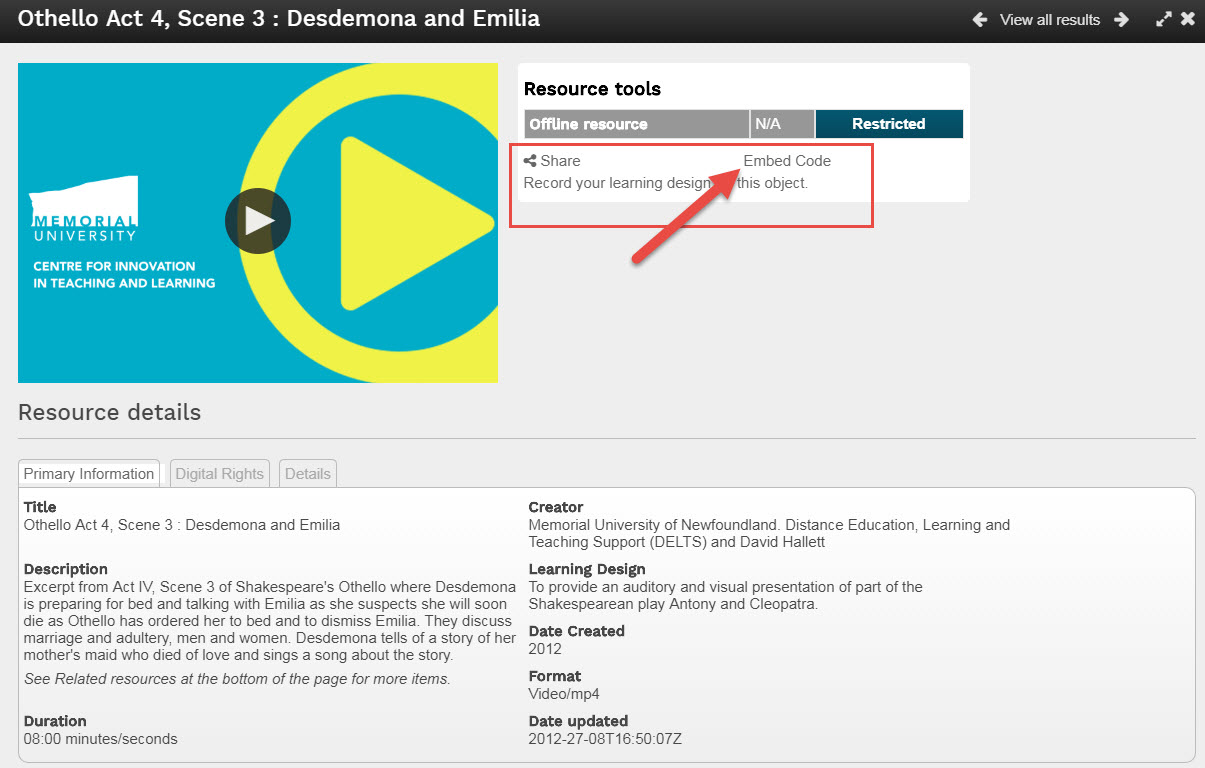 1. Once you have found an object you want to use, click Embed Code. Moving objects (like videos) will have an embed code; all other objects will have a hyperlink or can be downloaded.